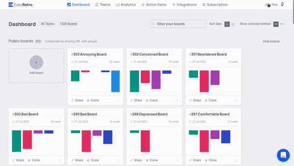 With this enhanced feature, it's easier to find boards created by a particular team member, even if their name is common or misspelled. Simply type in their name or email into the search bar located at the top of the Boards page, and EasyRetro will instantly display all the boards that the user has created.