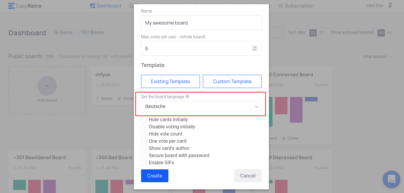 We're thrilled to announce that EasyRetro now supports localization in other languages! We understand the importance of providing our users with the option to use our platform in their preferred language, and we're excited to expand our reach to Portuguese, Spanish, French, German, Russian, Polish and Dutch speakers.